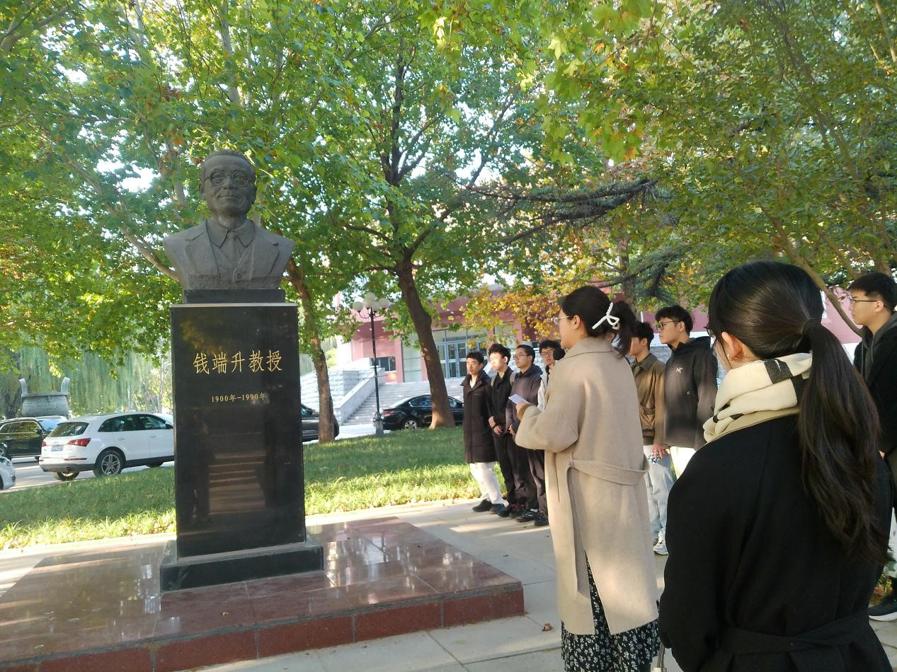 随着阳光穿透云层,师生们来到钱端升先生雕像前。思政2401班的吴佳芯接过宣讲话筒,介绍这座由1960届校友唐自熙捐资、国家一级雕塑师创作的雕像。1952年院系调整,钱端升先生受命筹建北京政法学院,毛主席亲签院长任命状。为汇聚师资,他“一请不成再叩门”,力邀费青、雷洁琼等学者到校工作;为解校舍难题,他当面向上级反映情况,推动海淀校区老教学楼建成。更动人的是他一生“四次申请入党”的执着,从1956年首次递交申请书,到1981年81岁终成党员,字里行间满是赤诚与坚守。