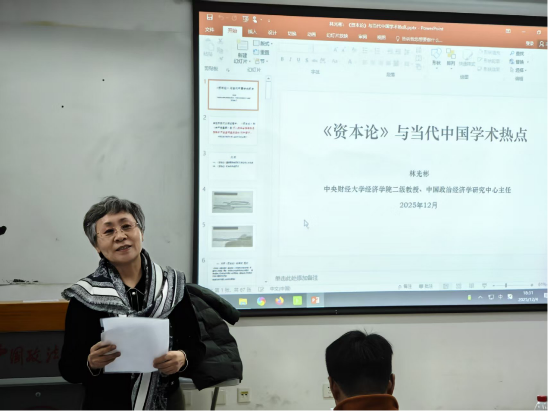 2025年12月4日晚,马克思主义学院院庆20周年系列活动之“新视野”学术讲座第162期在中国政法大学海淀校区综合楼0413教室成功举行。本期讲座主题为《资本论与当代中国学术热点》,特邀中央财经大学教务处处长、经济学院林光彬教授担任主讲人,中国政法大学马克思主义学院邰丽华教授担任主持人。马克思主义学院部分师生共30余人参与了本次活动。